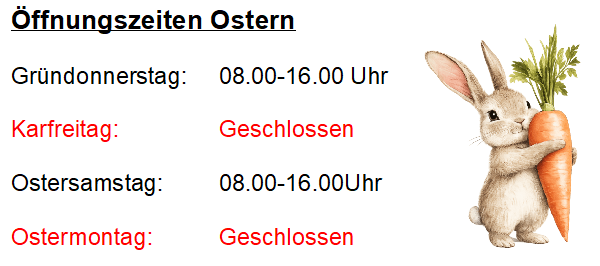08:00 – 12:00 / Nachmittag geschlossen